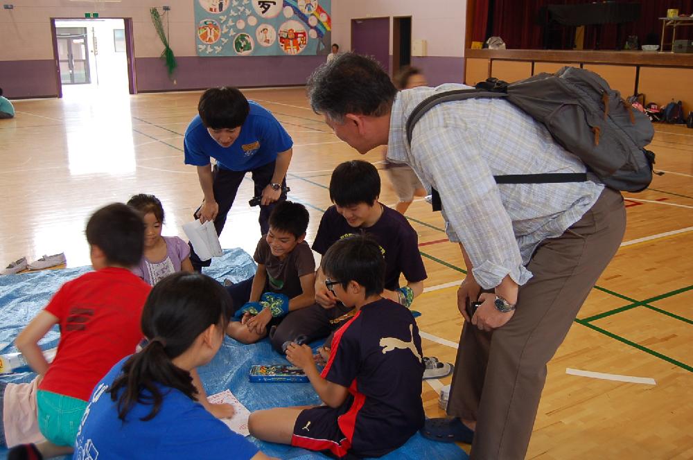 進行役を務めるのは代表の西原さん。子どもたちからはお兄さんとして大人気!優しい語り口調で子どもたちに競技のルールなどを説明していました。 それぞれのチームには高校生や大学生のお兄さん、お姉さんが入ります。 他の地域のてらこやさんが大阪や兵庫から応援に駆け付けていました。