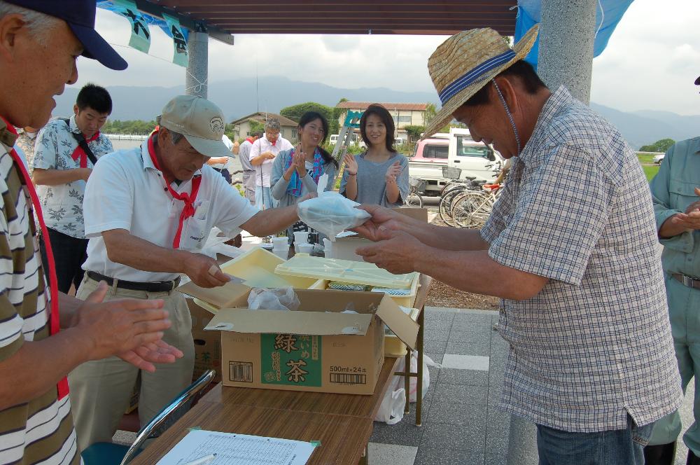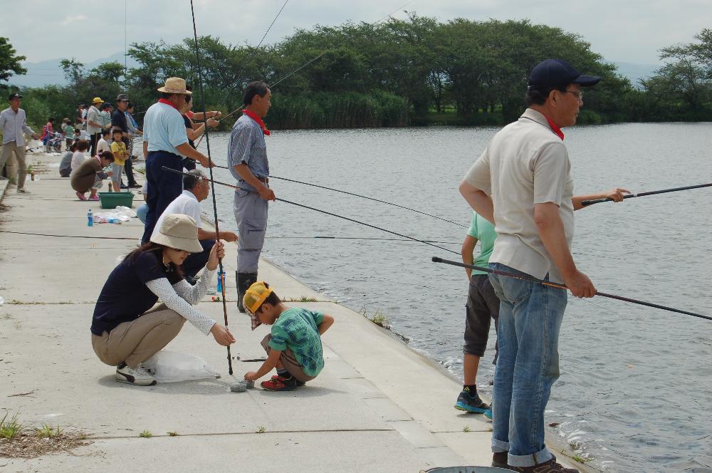 そんな中で行われたこの釣り大会には、ちいさいお子さんたちもたくさん集まって、終始楽しい声が響いていました。中でも若いお母さんが餌のミミズに悪戦苦闘している姿が微笑ましかったです。 2時間がすぎ、計量が行われ、参加者全員に湖魚の佃煮がプレゼントされた他、釣った総重量上位5名に賞品が授与されました。 釣果としては体長10センチ前後のブルーギルがよく釣れていましたが、中には30センチほどのブラックバスもあり、無事に釣り大会は終了しました。