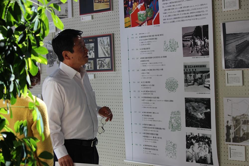 会場では、昭和29年~平成26年までの出来事を書いたタペストリーとA3の大きさに引き伸ばした写真を複数展示しました。 「市誕生の時は小学生だったの。この写真に私、写ってるのよ」と笑顔で話してくれる女性や、「草津に来たのは10年前だから、私が知らない草津を見ることができて嬉しい」と言ってくれました。 大人は懐かしげに、移住してきた人や子どもは今では想像できない草津の姿に興味津々です。
