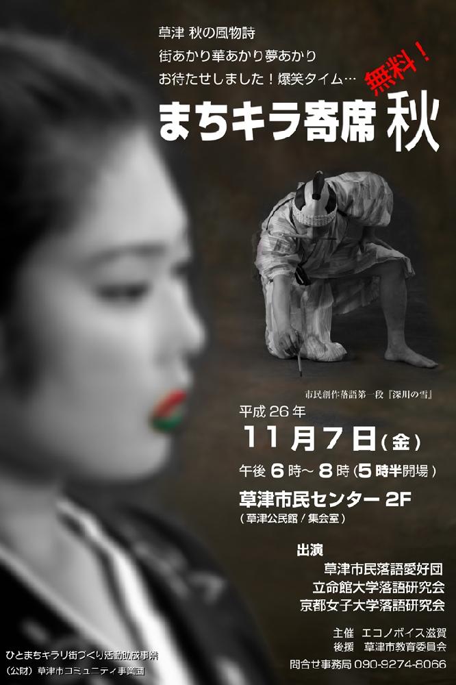 草津市民落語愛好団、立命館大学や京都女子大学も、みなさんを笑わせに はせ参じます。 秋の夜長は「まちキラ寄席 秋」で決まり!