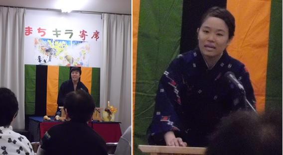 場が温まったところで、京都女子大学、立命館大学からは初々しい学生さんが一席。会場の笑いを誘っていました。 京都女子大学落語研究会に所属の「藤乃家 味鈴(ふじのや みりん)」さんは、帯を忘れて大慌て。でも、帯板にマフラーを巻くという荒業で急場をしのぎ、客席から拍手を… これ、ネタと違います。実話です(笑)