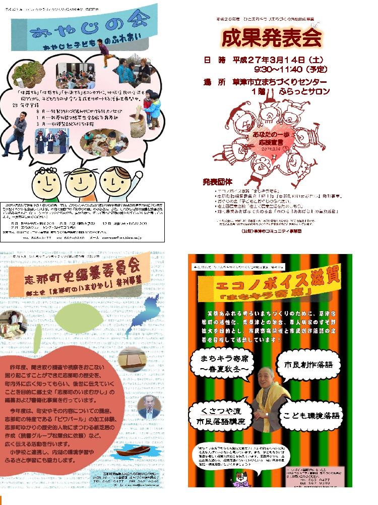 これら5団体の成果発表会を下記の通り開催します。 各団体の発表をお聞きいただき、 激励やアドバイスをいただきたいと思います。 ぜひお気軽に会場へお越しください。 日時 平成27年3月14日(土) 9:30~ 場所 草津市立まちづくりセンター1階 ふらっとサロン