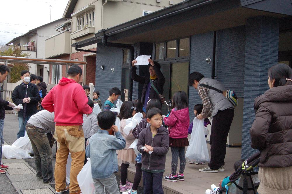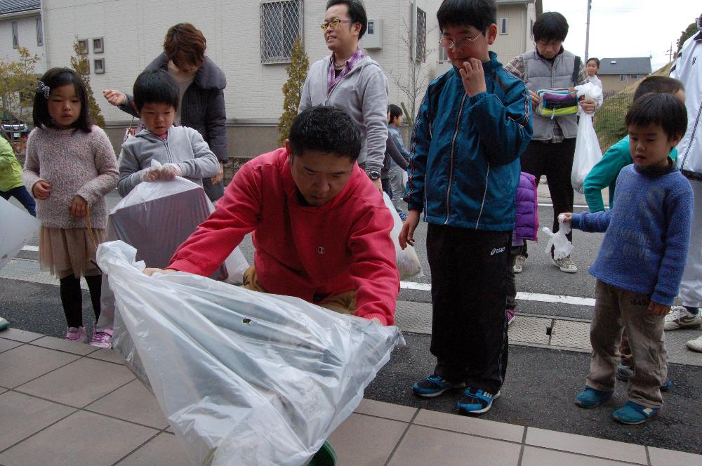 町内のごみ拾いから「きらりんピック」がスタートします! 中には3キロ以上のごみを拾ってくれた子どももいました。 「こんないっぱい拾ったで!」「傘とかも捨ててあった!」 「車、危なかったな」「おっきなガラスが落ちてたわ」 普段は見過ごしてしまうことも、注意深く目を向けて 子どもたちも、まちのいろんな問題が見えてきたようです。