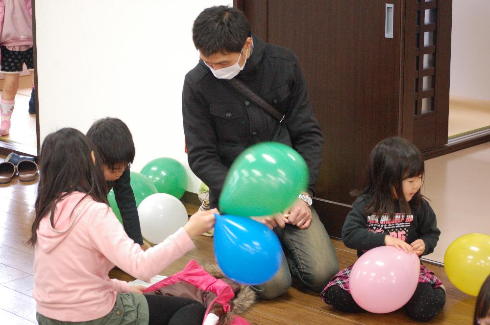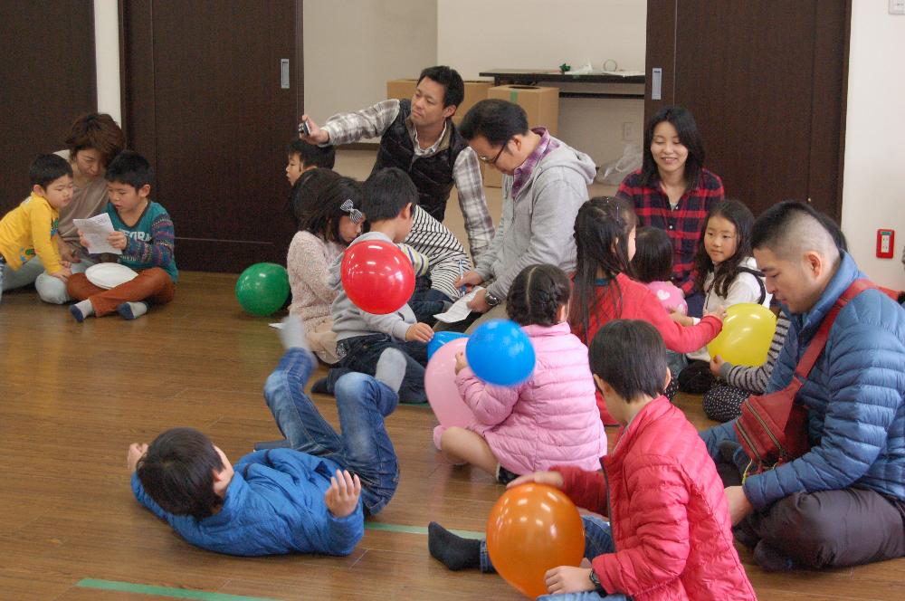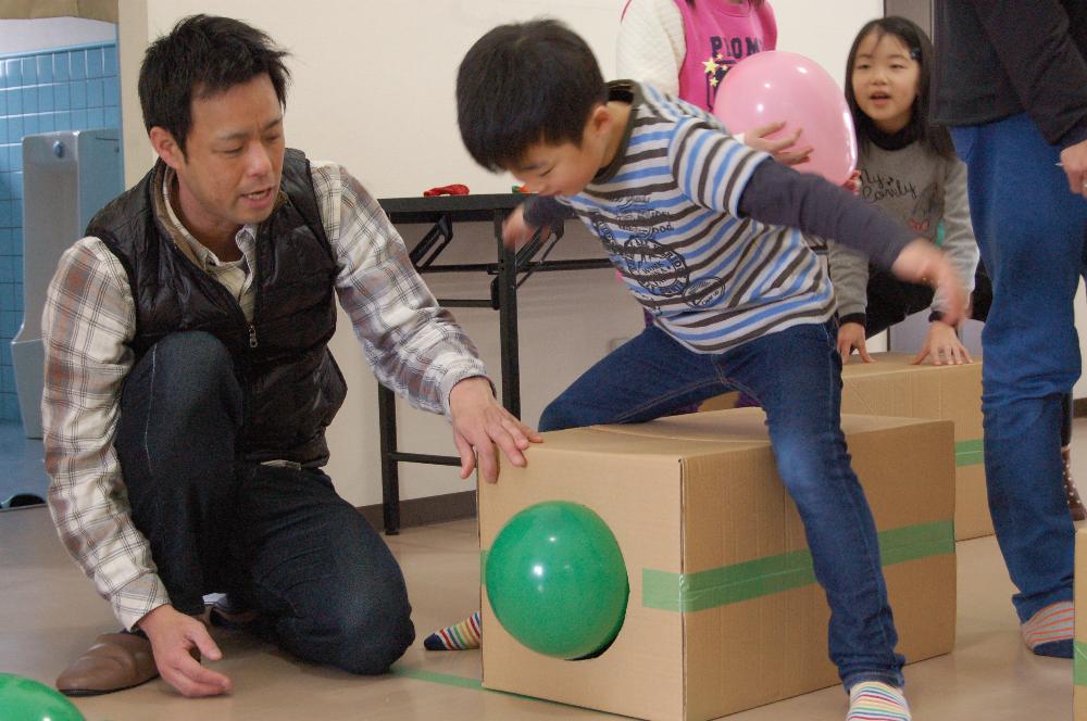 ごみの計量が終わったら、会館内での競技開始です。 風船バズーカ、台車カーリング、紙皿円盤投げ… 親子でそれぞれの競技に挑戦しました。 大人がそっと助けてあげて上手に風船を飛ばすことができました。