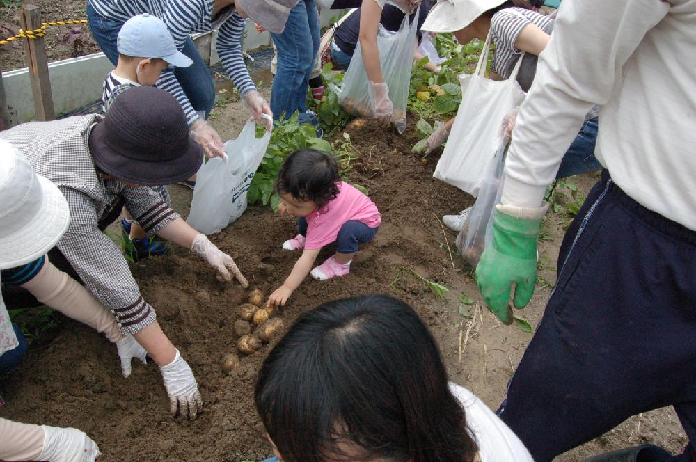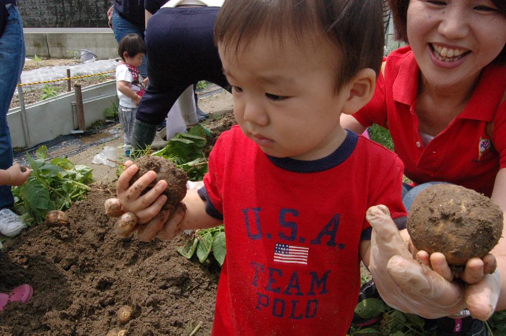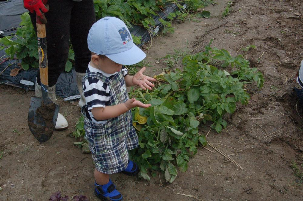 「ジャガイモどこ~?」畑を見回しても、ジャガイモが見当たりません。子どもたちはキョロキョロ。 「さあ、ひっぱってや~!!!」 コスモスの会代表の宇野さんが子どもたちを誘導し、 土を掘り起こすと出るわ出るわ… ジャガイモは土の中にできるのか!びっくりの子どもたち。