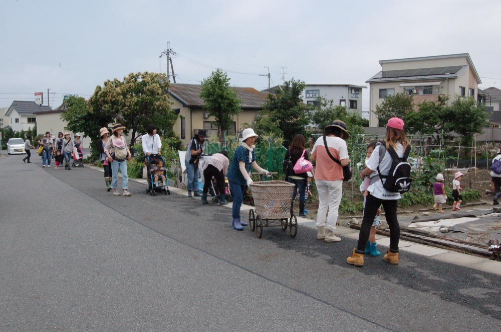 6月12日(金) 今日は、子育てサロンコスモスの会のジャガイモ掘りの日です。 昨日からの雨で開催があやぶまれましたが、 ジャガイモ掘りの時間が近づくにつれ 雲が晴れ、お日様が顔を出しました。 集合場所から畑までは少し距離がありますが、 長靴をはき帽子をかぶった子どもたちは、お母さんと一緒に畑に到着。