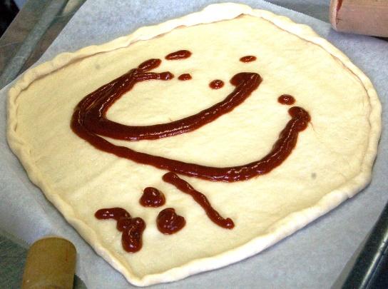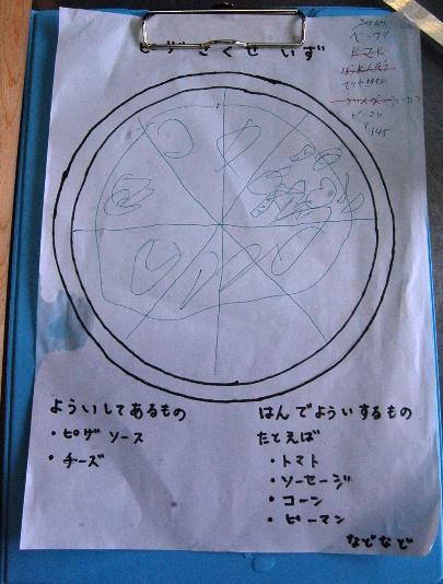 調理室へ戻ったら次は、どんな風に具材をピザに載せるかレイアウトを描きます。どんなものを作ろうか考えていると、何だかワクワクしてやる気がでてきますね。 いよいよ調理の開始です。低学年の子もお姉ちゃんに手を添えてもらいながら、ゆっくりと包丁を使っています。