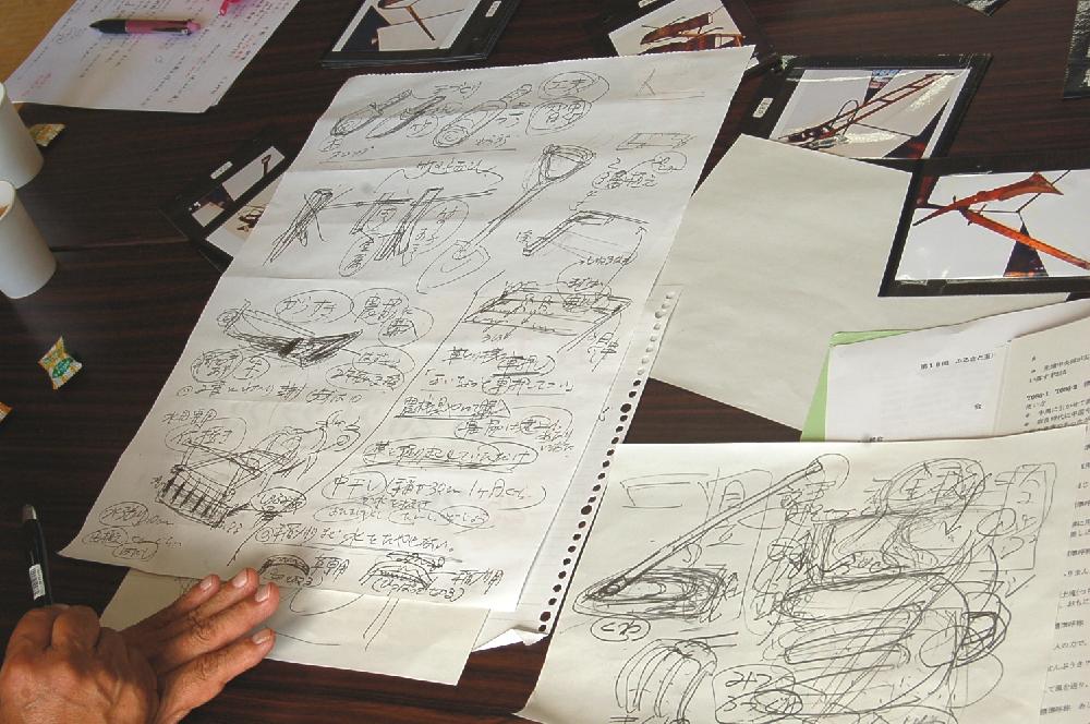 お話を聞きながら、メンバーの一人は農具をスケッチしていきます。聞き取りが終わるころには民具の絵が用紙いっぱいになりました。 地元の方がしみじみと「稲作は飯になるまで水加減」といわれます。名言ですね。この日の聞き取りで農業にとっての水の大切さを知りました。