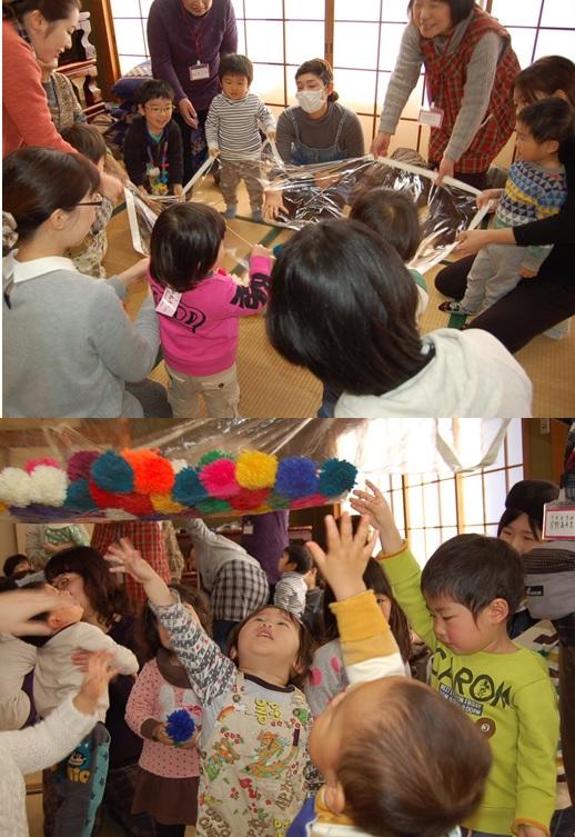さて、作業もひと段落。 毛糸のポンポンを透明のビニールシートの上に集めると、 大人が持ち上げアーチを作りました。 子どもたちは、ポンポンアーチの下で大はしゃぎ。 背伸びしたりジャンプしたり。