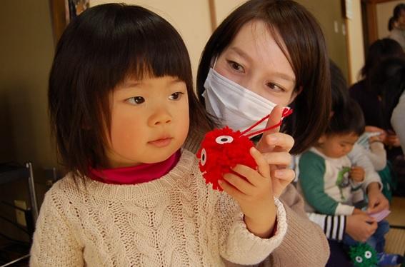 手遊びが終わり子どもたちの気分がアップしたところで、 今日の先生の紹介です。 以前「新聞で遊ぼう」が大好評だったあおたにさとみ先生から 毛糸を使った遊びを教えてもらいます。 色とりどりの毛糸でネックレスを作ったり、 毛糸のポンポンを作ったりしてみんな元気に遊びました。 一生懸命穴に毛糸を通す子ども、 毛糸そっちのけでお友達と走り回る子ども、 子どもより一生懸命なお母さん(笑) 暖かな日が差し込む部屋の中、 楽しいふれあいの時間を過ごすことができました。
