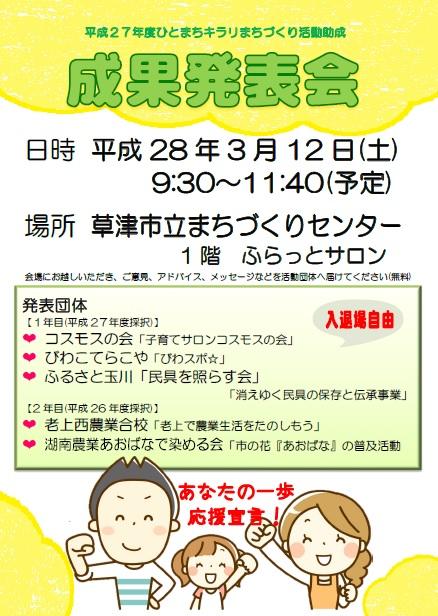 子育て中のお母さんたちにとって、 なくてはならない存在になってきた「コスモスの会」 そのコスモスの会を含め、「ひとまちキラリ助成」をうけた 計5団体が3月に行われる成果発表会で 今年度の活動実績と次年度の活動提案を発表します。 是非ご来場の上、各団体の頑張りを見ていただき、 応援、激励、アドバイスなど、各団体に届けてください。 (入退場自由・無料)