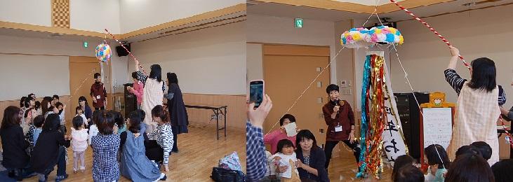 4月15日(金)、子育てサロン コスモスの会の今年度のオープニングイベントが行われました。当日は子どもたちによるくすだま割りから始まりました。「祝 1周年おめでとう」の文字とともに花吹雪が舞い、子どもたちのびっくりする顔とその後の嬉しそうな顔。しばらくは床に落ちた花吹雪とたわむれる子どもたちでした。
