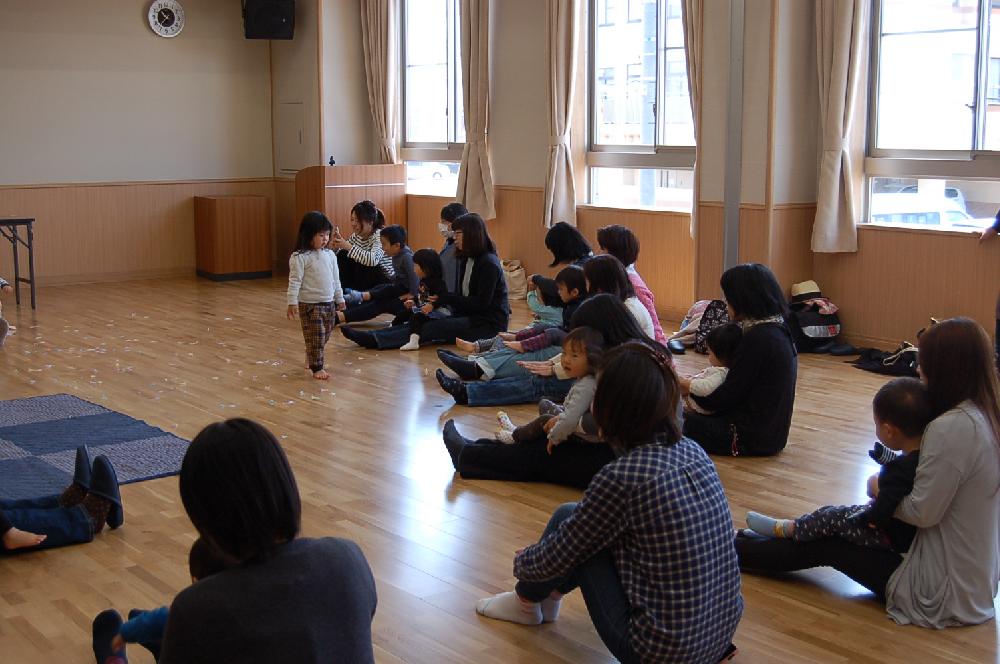 「おすわりや~す いすだっせ」の歌詞から始まる親子遊び。長座しているお母さんの太ももに座ってゆすぶられて良い気分の子どもたち。最後に「落ちまっせ」でお母さんが足を開くと子どものお尻が床にトン! びっくりしてから笑いに変わる子どもたち。なんだかおもしろい。